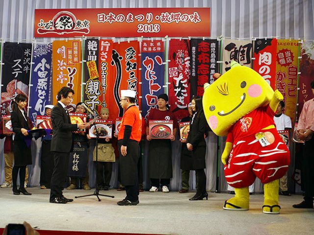 悲願の鯛茶漬けグランプリの表彰を受ける柏崎地域観光復興推進協議会の佐藤秀則・鯛プロジェクト部会長(中央)=20日、東京ドーム (2013/01/21)