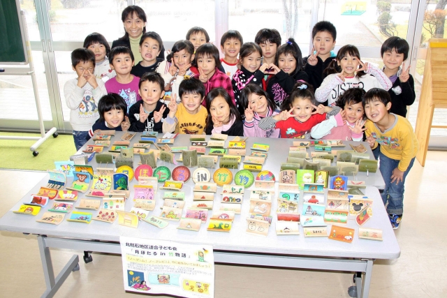 「月ほたる」活動で竹に描いた作品と1年生たち=北鯖石小 (2013/01/23)