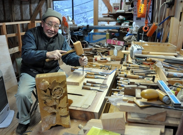 仕事場で彫り物に取り組む赤川清さん。手前の作品は浮き彫りの第1号=市内谷根 (2013/01/25)