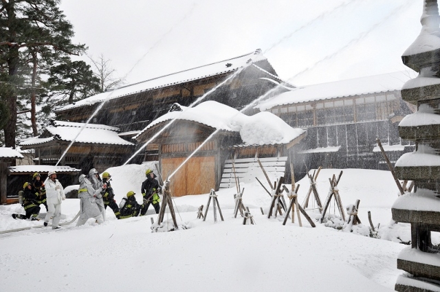 文化財防火デーにちなんで行われた飯塚邸での消防訓練=市内新道 (2013/01/26)