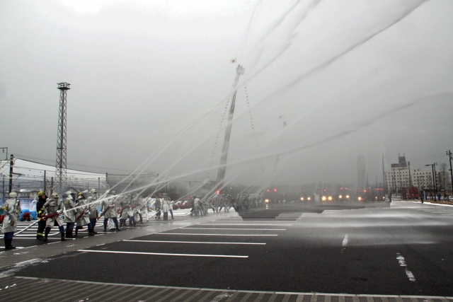 消防署員と消防団員が一斉放水した市消防出初め式=6日、市内日石 (2013/01/07)