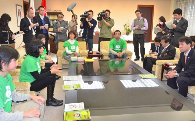 柏崎原発再稼働問題で泉田知事(右手前)と面談する「みんなで決める会」メンバー=11日午後、県庁知事室 (2013/01/12)