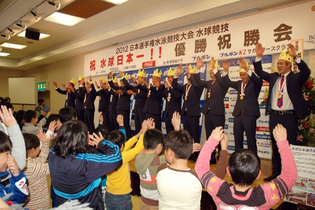 ジュニア選手から贈られた“王冠”をかぶって万歳三唱するブルボンKZ選手=1日、産文会館 (2012/12/03)