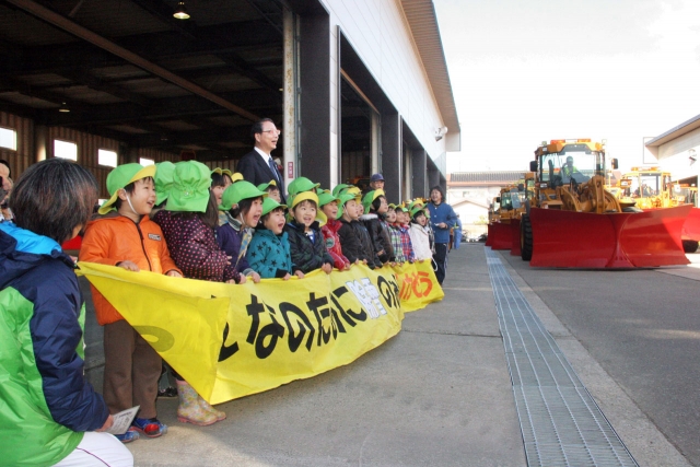 園児の激励を受け、市中に出発する除雪車=3日、市内藤元町の除雪基地 (2012/12/04)