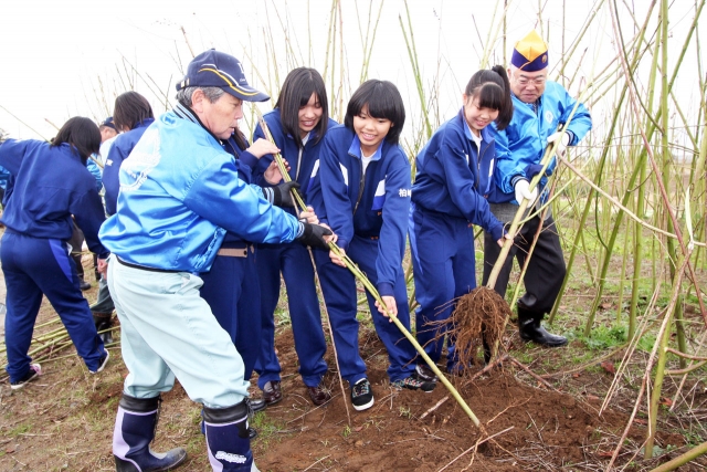 柏崎ライオンズ会員とケナフ畑で刈り取り作業を行う東中3年生 (2012/12/05)