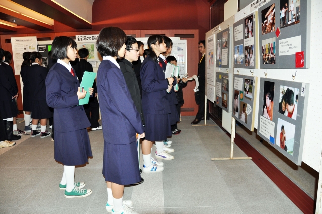 「いのち・愛・人権」柏崎展でパネルに見入る中学生=5日、アルフォーレ市民ラウンジ (2012/12/06)