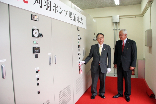 新設の送水ポンプ場でスイッチを押す会田市長(左)と品田村長 (2012/10/01)