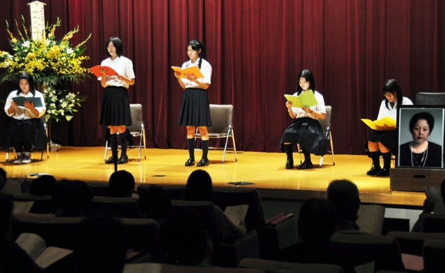 中村千栄子さんを偲ぶ会でカンタータ「良寛と貞心」を朗読する常盤高校演劇同好会=柏崎エネルギーホール (2012/10/03)