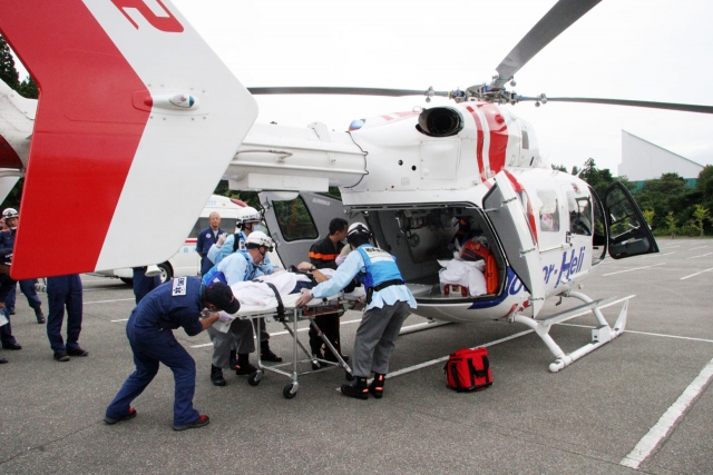ドクターヘリの運航を前に、連携訓練を行う関係者=佐藤池運動広場駐車場 (2012/10/04)