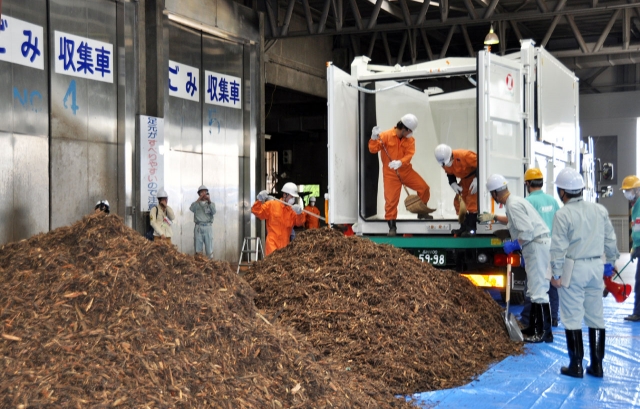 岩手県大槌町から搬入された震災がれき。各作業工程で慎重に測定が進められた=10日午前、クリーンセンターかしわざき (2012/10/10)