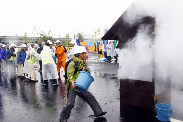 市総合防災訓練で地域の結束力を発揮した水バケツリレーによる消火活動 (2012/09/24)