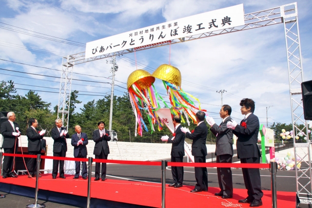 ぴあパークとうりんぼ竣工式典でくす玉を割る品田村長(左) (2012/09/25)