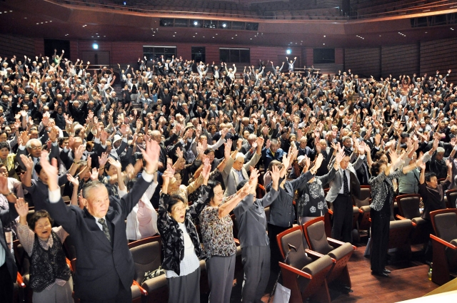 80歳を祝う市の第2次成人式で元気に万歳三唱をする出席者=26日、アルフォーレ (2012/09/26)