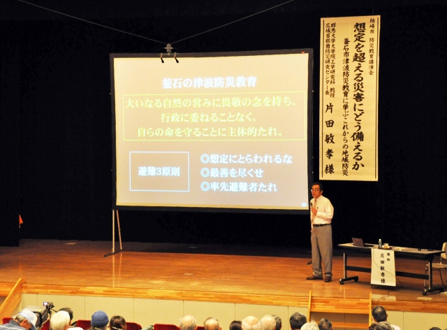 防災教育の講演を行う片田敏孝・群馬大広域首都圏防災研究センター長・教授=産大 (2012/09/28)