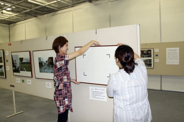 8日から始まる写真展の準備をする福島県からの避難者ら=7日、ソフィアセンター (2012/09/07)