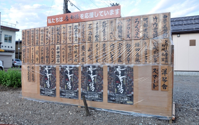 まちなかを歌や演奏でつなぐ「音市場」のPR看板=市内東本町2 (2012/09/08)