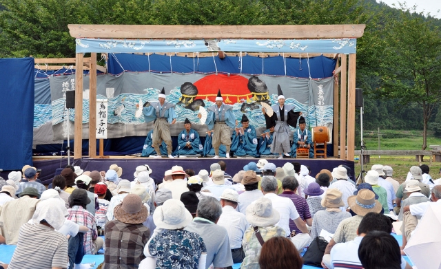 綾子舞の現地公開で演じられた狂言「烏帽子折」=9日、市内女谷の綾子舞会館前の芝生広場 (2012/09/10)