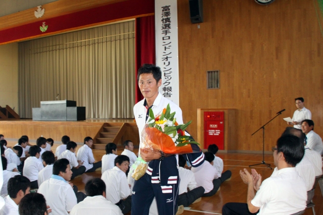 母校でロンドン五輪報告を行った富沢選手=10日、柏工体育館 (2012/09/11)