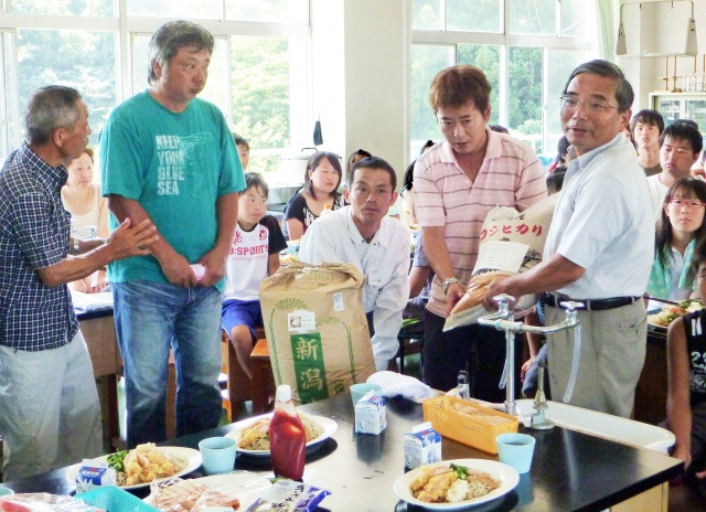 柏崎のおいしいコメを食べてと恵明学園にコメを贈る専農経営者会議の布施会長(右から2人目)=2日 (2012/08/03)