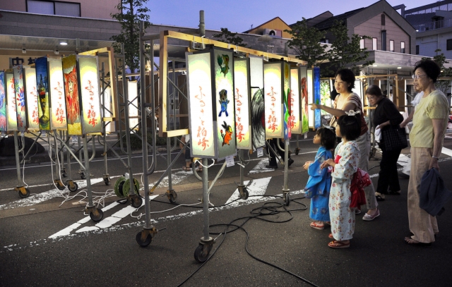 中・高校生の絵あんどん作品に見入る家族連れら=市内東本町1 (2012/08/06)