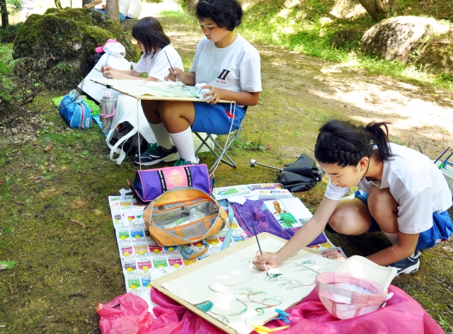 夏休み写生大会で絵筆を走らせる参加者=7日午前、赤坂山公園 (2012/08/08)