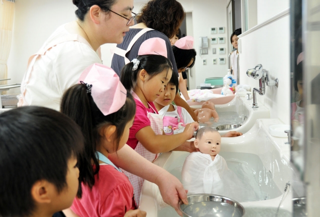 人形の赤ちゃんを使ってもく浴などを体験する小学生=新潟病院附属看護学校 (2012/08/10)