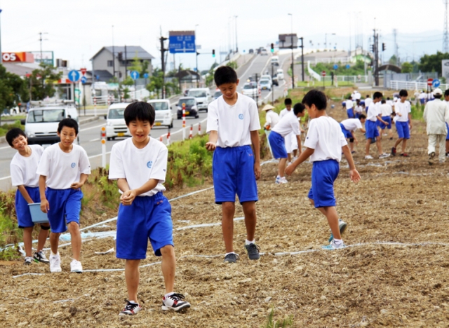 国道8号バイパスでソバの実をまく鏡が沖中の生徒=市内半田1地内 (2012/08/11)