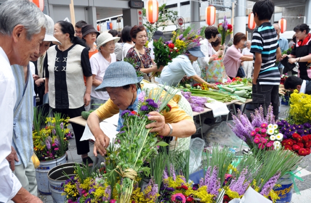 お盆を前にしてにぎわった伝統の花市=11日、市民プラザ前 (2012/08/12)