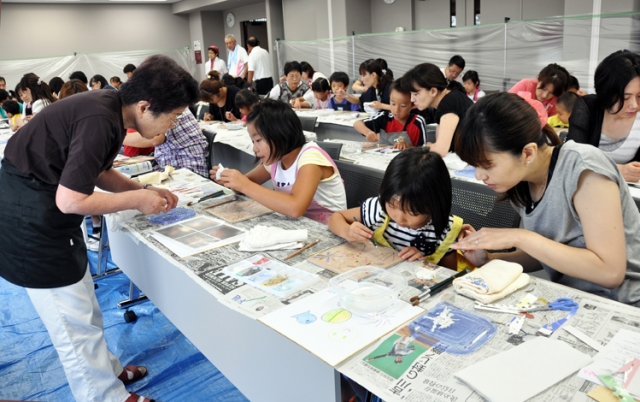 花火の絵を描き、メモリアルタイルを作る親子たち=アルフォーレ (2012/08/13)
