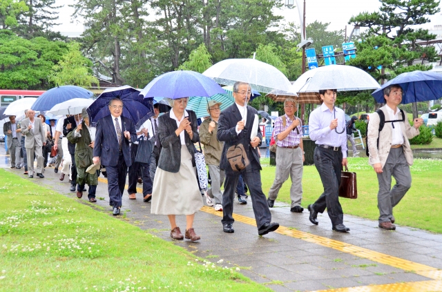 柏崎刈羽原発運転差し止め訴訟の第1回口頭弁論で新潟地裁に入る原告団・弁護団=12日午前、新潟市中央区 (2012/07/12)