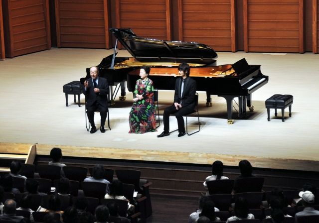 作曲家の池辺晋一郎さん(左)とピアニスト2人によるトーク=12日、アルフォーレ・大ホール (2012/07/13)