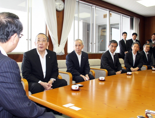 会田市長(左端)と面談する東京電力の下河辺会長(左から2人目)、広瀬社長(同3人目)=13日午後2時半ごろ、市役所市長応接室 (2012/07/14)