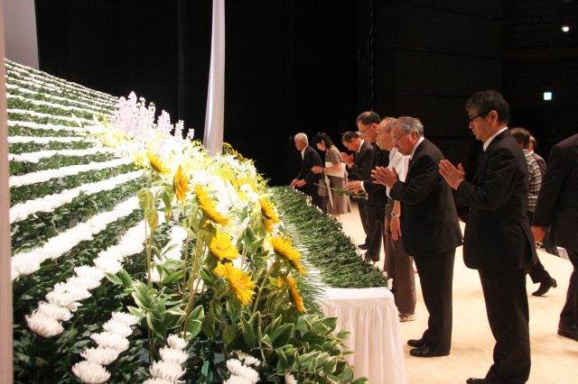 柏崎刈羽の犠牲者15人の冥福を祈り、手を合わせた合同追悼式=16日、アルフォーレ (2012/07/17)