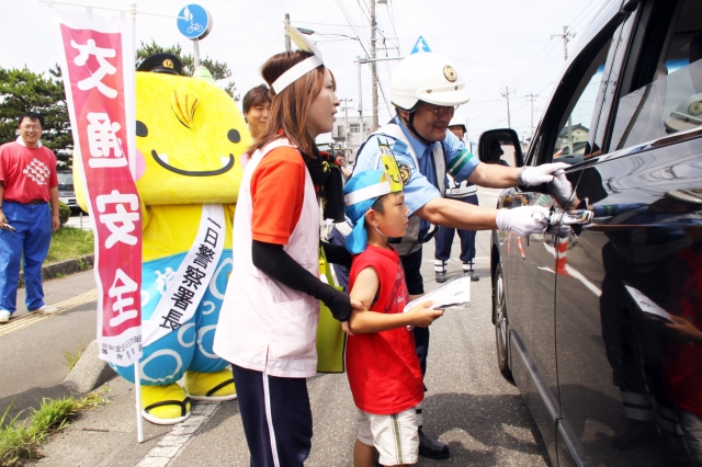 えちゴンと一緒にドライバーに安全運転を呼び掛ける保育園児=18日、柏崎署前 (2012/07/18)
