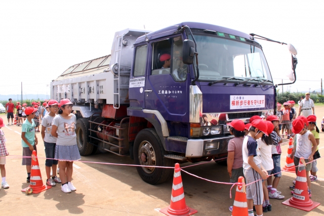 ダンプカーの運転席からは見えない「死角」を体験する児童=20日、槙原小 (2012/07/20)