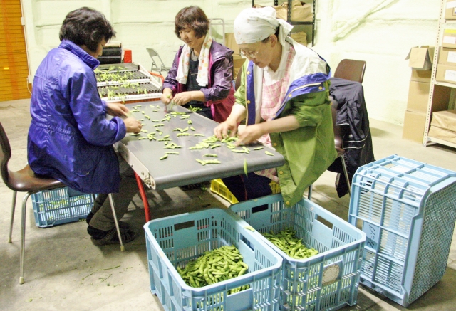 おいしさを保つため室温20度の中で枝豆選別作業=市内西山町、ファーミング・スタッフ (2012/07/21)