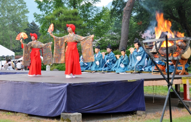 鵜川地区の「まつり」で、かがり火がたかれる中で行われた綾子舞上演 (2012/07/03)