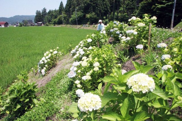 水田のあぜのり面で花を咲かせるアジサイ=市内南条地内 (2012/07/04)