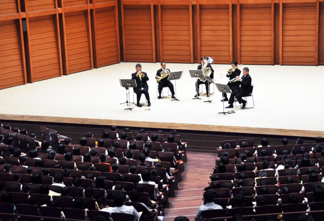 開館3日目のアルフォーレで行われた小中学生音楽鑑賞会。金管五重奏に耳を傾けた=10日 (2012/07/11)