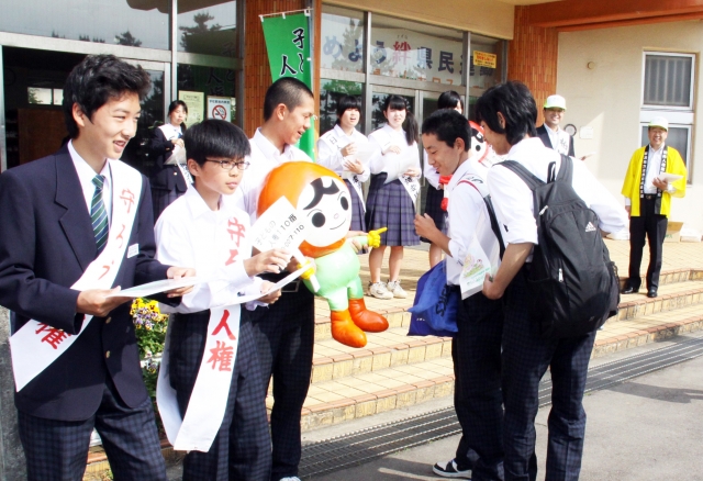 登校時間に人権のリーフレットを手渡す松浜中の生徒会役員=1日 (2012/06/01)