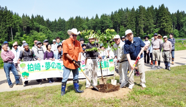 夢の森公園の開園5周年を記念した植樹。会田市長(右端)と品田村長(左端) (2012/06/02)