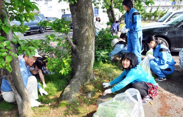 全市一斉のクリーンデー。宮場町では子どもからお年寄りまで150人が草取りなどに取り組んだ=3日、枇杷島コミセン周辺 (2012/06/04)