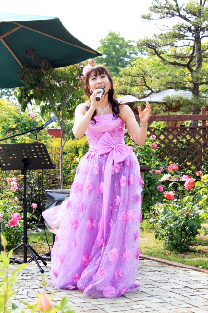 満開のバラ園でデビュー曲を歌う宮嶋奈緒子さん=3日、市内藤井 (2012/06/05)