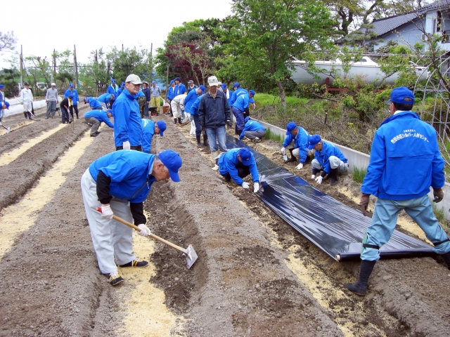 体験型「みんなの農場」で里芋の種芋の定植作業をする世田谷区のシ ルバー会員=市内橋場 (2012/05/18)