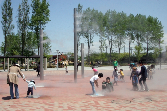リニューアルした駅前公園で子どもたちの人気を集めるミスト噴水 (2012/05/19)