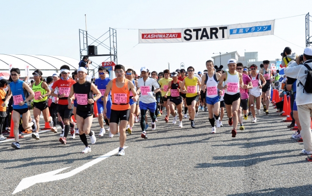 潮風マラソン・フルの部で一斉にスタートするランナー=みなとまち海浜公園 (2012/05/21)