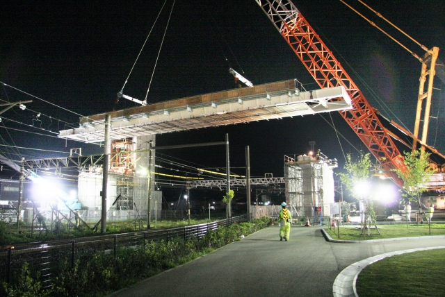 JR線をまたぎ、けたの据え付け作業が行われた南北連絡歩道橋=22日午前2時過ぎ、駅前公園 (2012/05/22)
