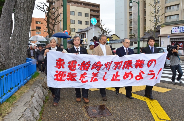 柏崎刈羽原発運転差し止め訴訟の訴状提出に向かう原告団など=23日午後1時前、新潟市中央区の新潟地裁前 (2012/04/23)