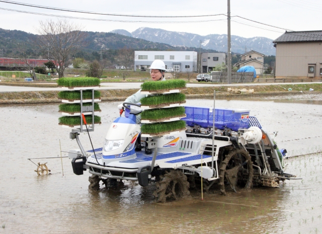 県内トップの田植えで、会田市長も苗植え=26日、市内藤井地内 (2012/04/26)