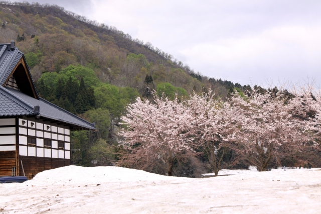雪が残る中で満開の桜=27日、市内女谷地内 (2012/04/27)